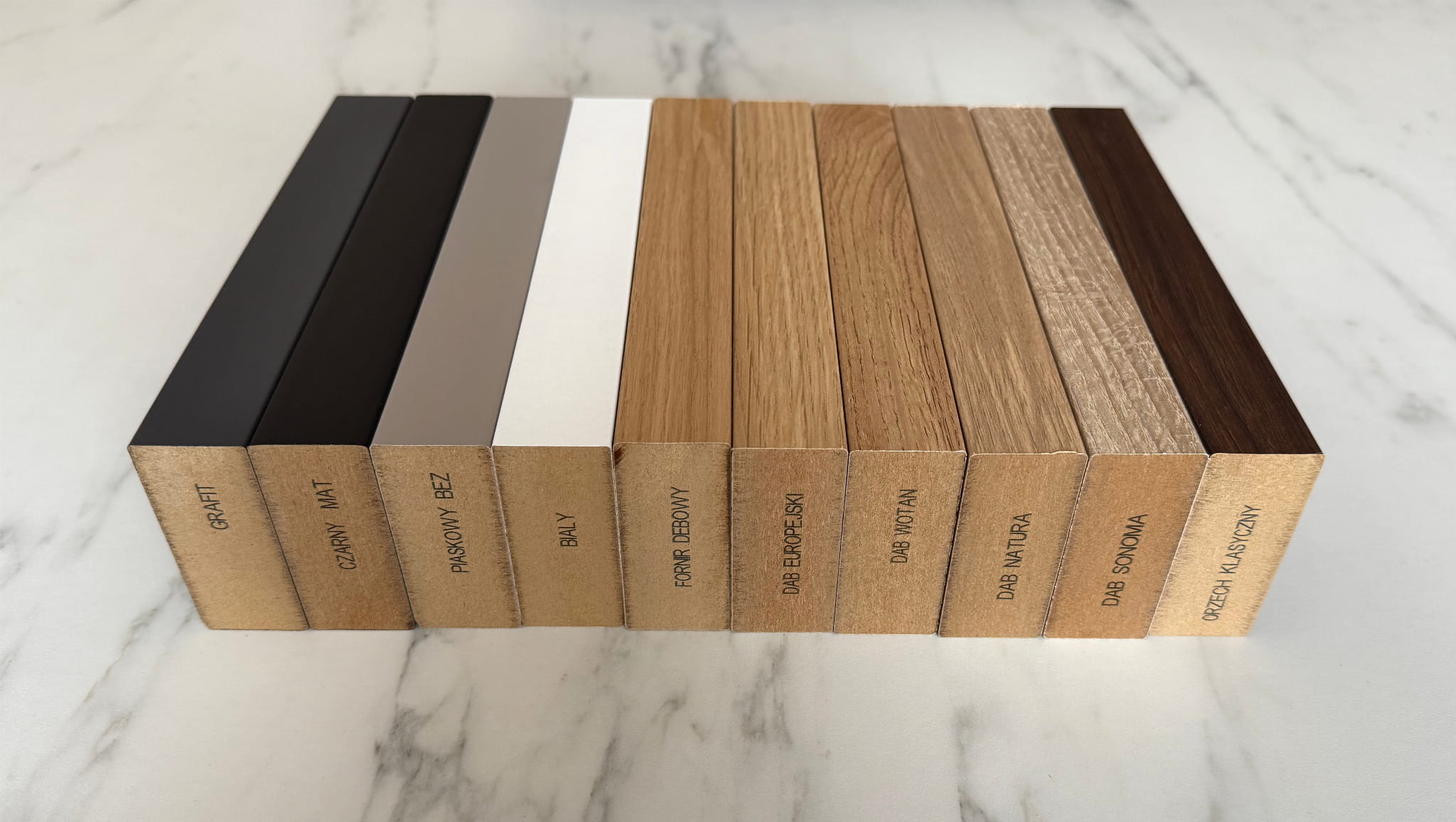 - Każda próbka wykonana z wytrzymałego MDF i wykończona 4-stronną okleiną.