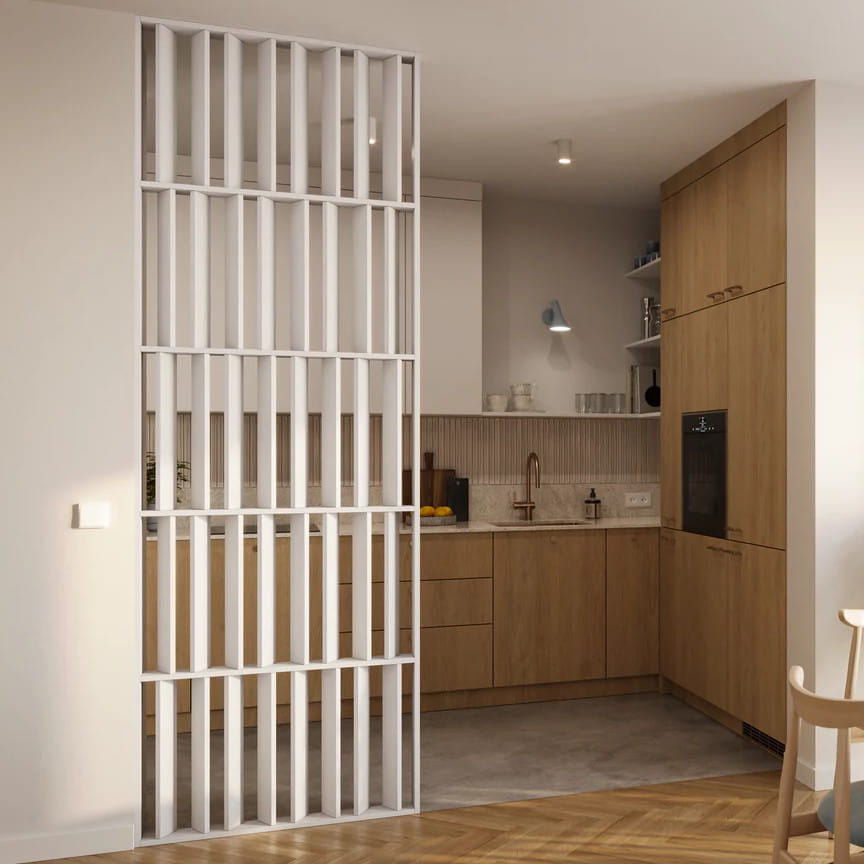 Ścianka z lameli Japandi w kolorze białym to nowoczesna i dekoracyjna przegroda inspirowana stylem japandi. Charakterystyczny układ poziomych podziałów oraz pionowych lameli tworzy geometryczną, harmonijną kompozycję, która przyciąga wzrok i nadaje wnętrzu designerski charakter. Ażurowa konstrukcja subtelnie oddziela strefy – np. salon od kuchni lub jadalni – jednocześnie przepuszczając światło i zachowując wrażenie przestronności.
