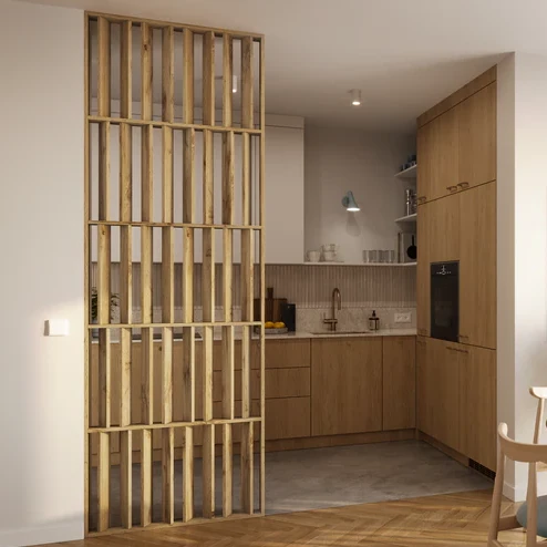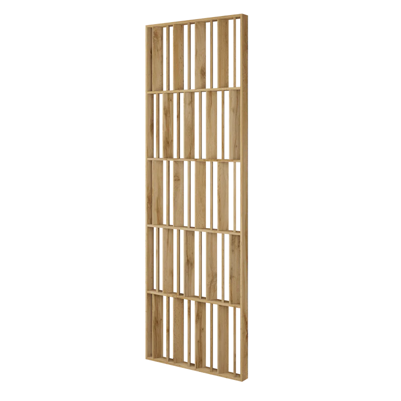 Ścianka z lameli Japandi w kolorze Dąb Wotan to nowoczesna i dekoracyjna przegroda inspirowana stylem japandi, łączącym minimalizm z naturalnym ciepłem drewna. Charakterystyczny układ poziomych podziałów oraz pionowych lameli tworzy geometryczną, harmonijną kompozycję, która przyciąga wzrok i nadaje wnętrzu designerski charakter. Ażurowa konstrukcja subtelnie oddziela strefy – np. salon od kuchni lub jadalni – jednocześnie przepuszczając światło i zachowując wrażenie przestronności.