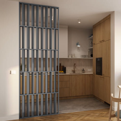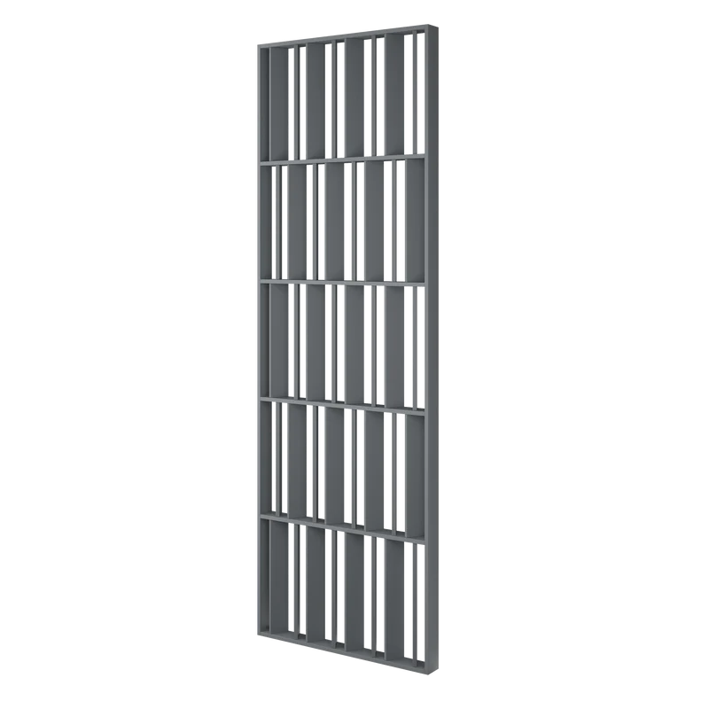 Ścianka z lameli Japandi w kolorze grafitowym to nowoczesna i dekoracyjna przegroda inspirowana stylem japandi. Charakterystyczny układ poziomych podziałów oraz pionowych lameli tworzy geometryczną, harmonijną kompozycję, która przyciąga wzrok i nadaje wnętrzu designerski charakter. Ażurowa konstrukcja subtelnie oddziela strefy – np. salon od kuchni lub jadalni – jednocześnie przepuszczając światło i zachowując wrażenie przestronności.