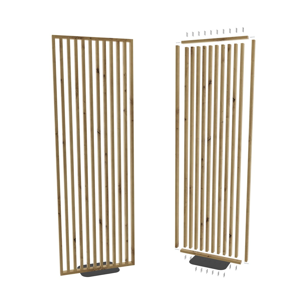 Lamele wolnostojące tworzące ażurową ściankę działową w odcieniu drewna - Dąb Artisan to funkcjonalne i estetyczne rozwiązanie do wydzielania stref w mieszkaniu, biurze lub przestrzeni komercyjnej. Stalowa podstawa o wymiarach 60x40 cm zapewnia stabilne oparcie. Ścianka z lameli pozwala zachować lekkość wnętrza i dostęp światła, jednocześnie wyraźnie porządkując przestrzeń.