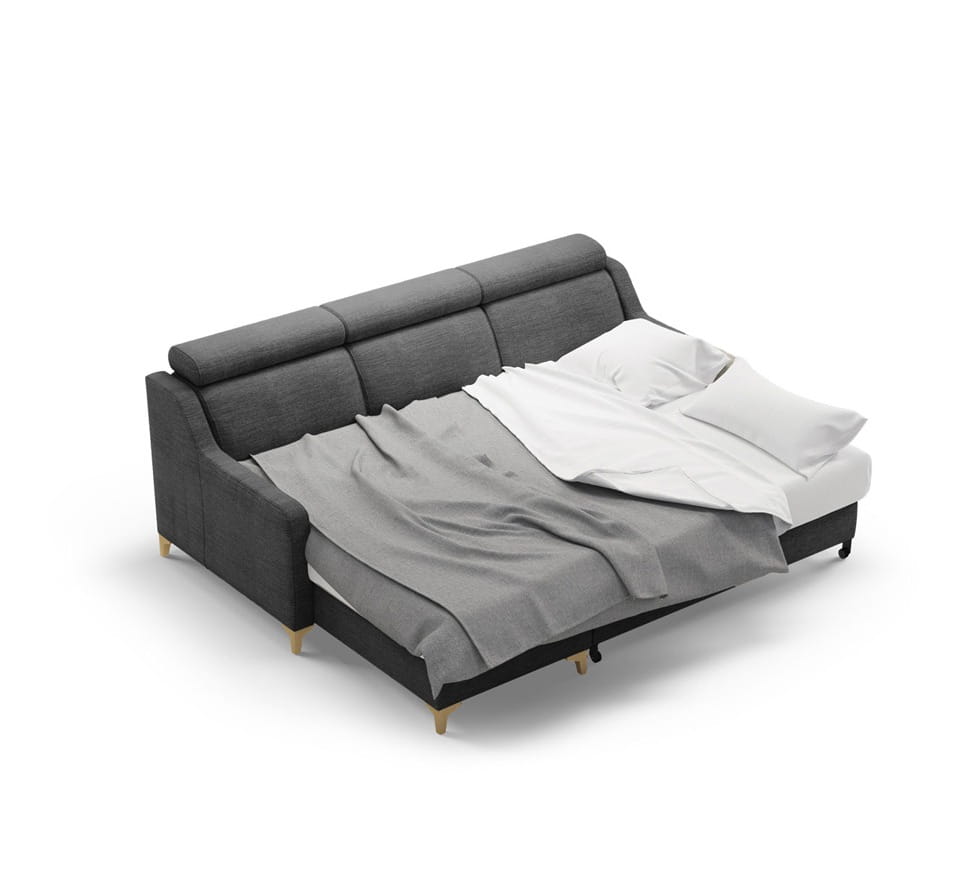 - Trzyosobowa sofa z funkcją spania – mechanizm typu Delfin umożliwia szybkie rozkładanie.