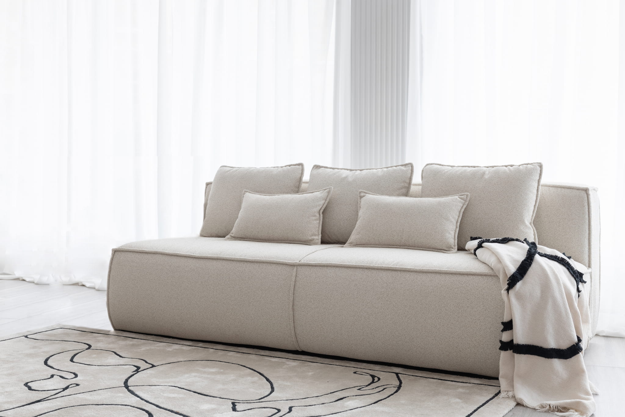 - Sofa Igo wyróżnia się prostym, geometrycznym kształtem bez podłokietników – idealna do nowoczesnych wnętrz.
