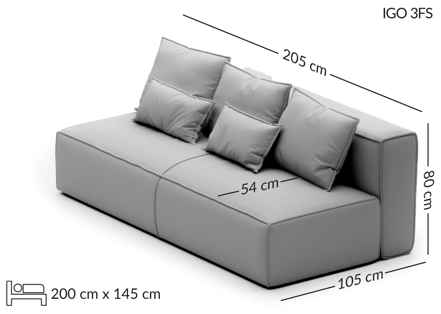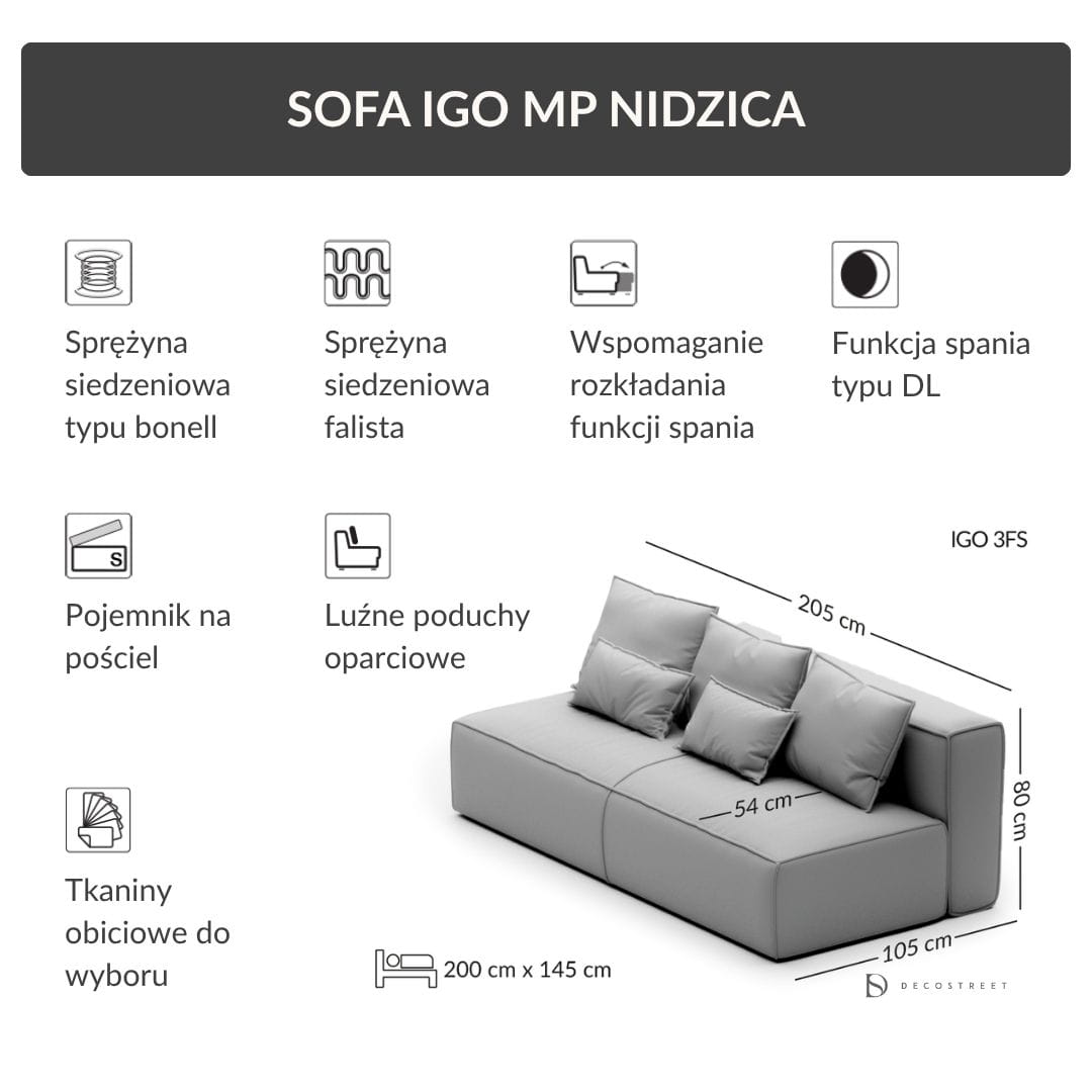 Sofa Igo to nowoczesny, minimalistyczny mebel o prostej bryle, pozbawiony podłokietników i zbędnych ozdobników. Dzięki temu z łatwością dopasuje się do współczesnych wnętrz – zarówno w salonie, pokoju gościnnym, jak i w pokoju dziecka. Model łączy elegancką formę z funkcjonalnością - posiada rozkładaną funkcję spania oraz pojemnik na pościel.