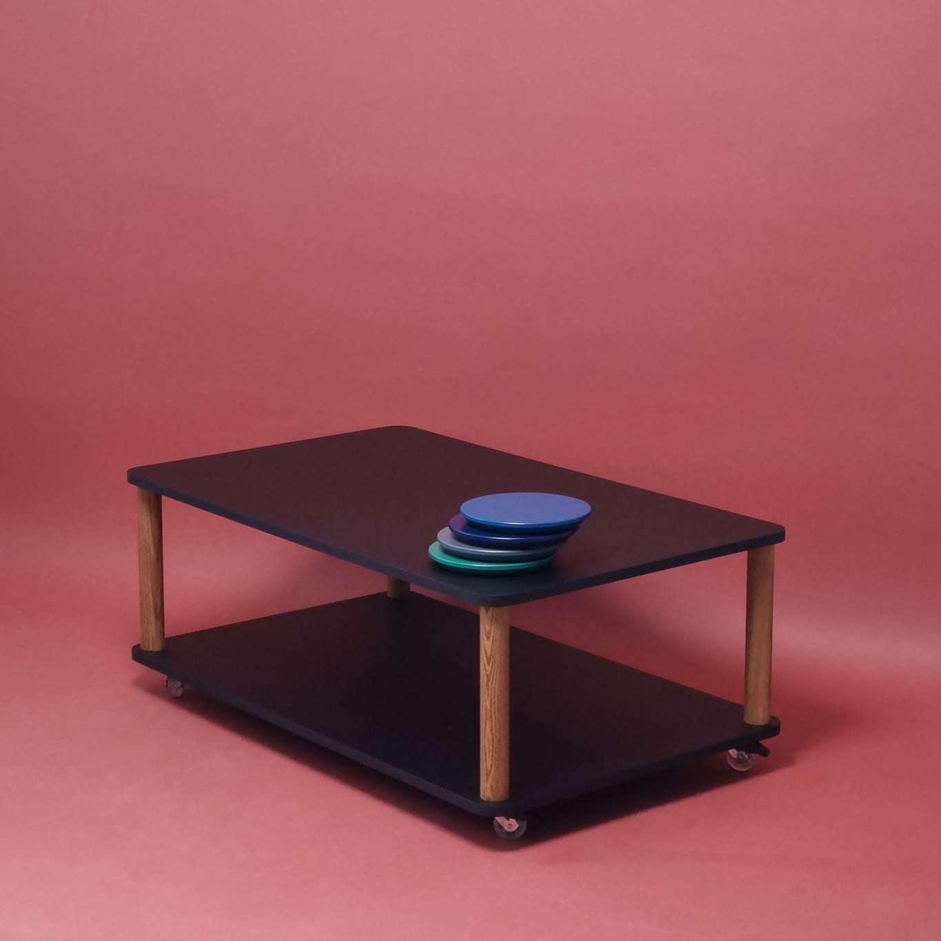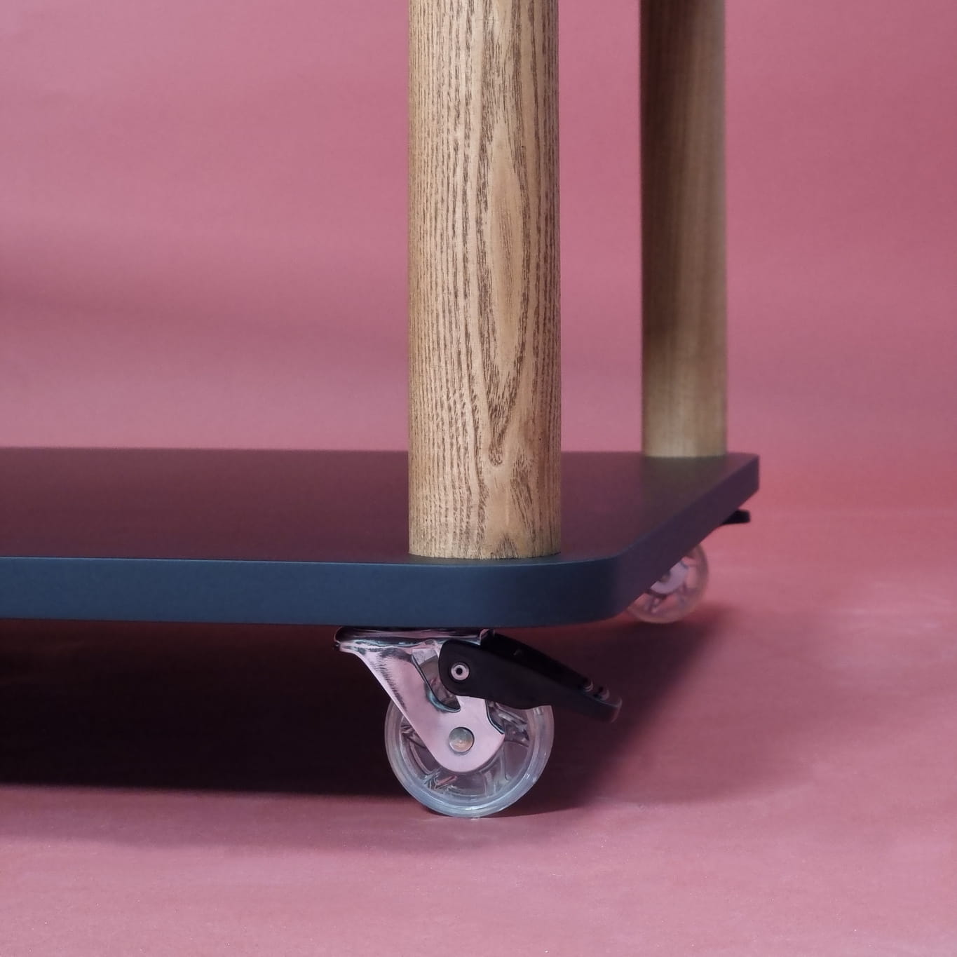 - Cztery koła umożliwiają łatwe przemieszczanie stolika, a mechanizm hamulcowy zapobiega przypadkowemu ruchowi.