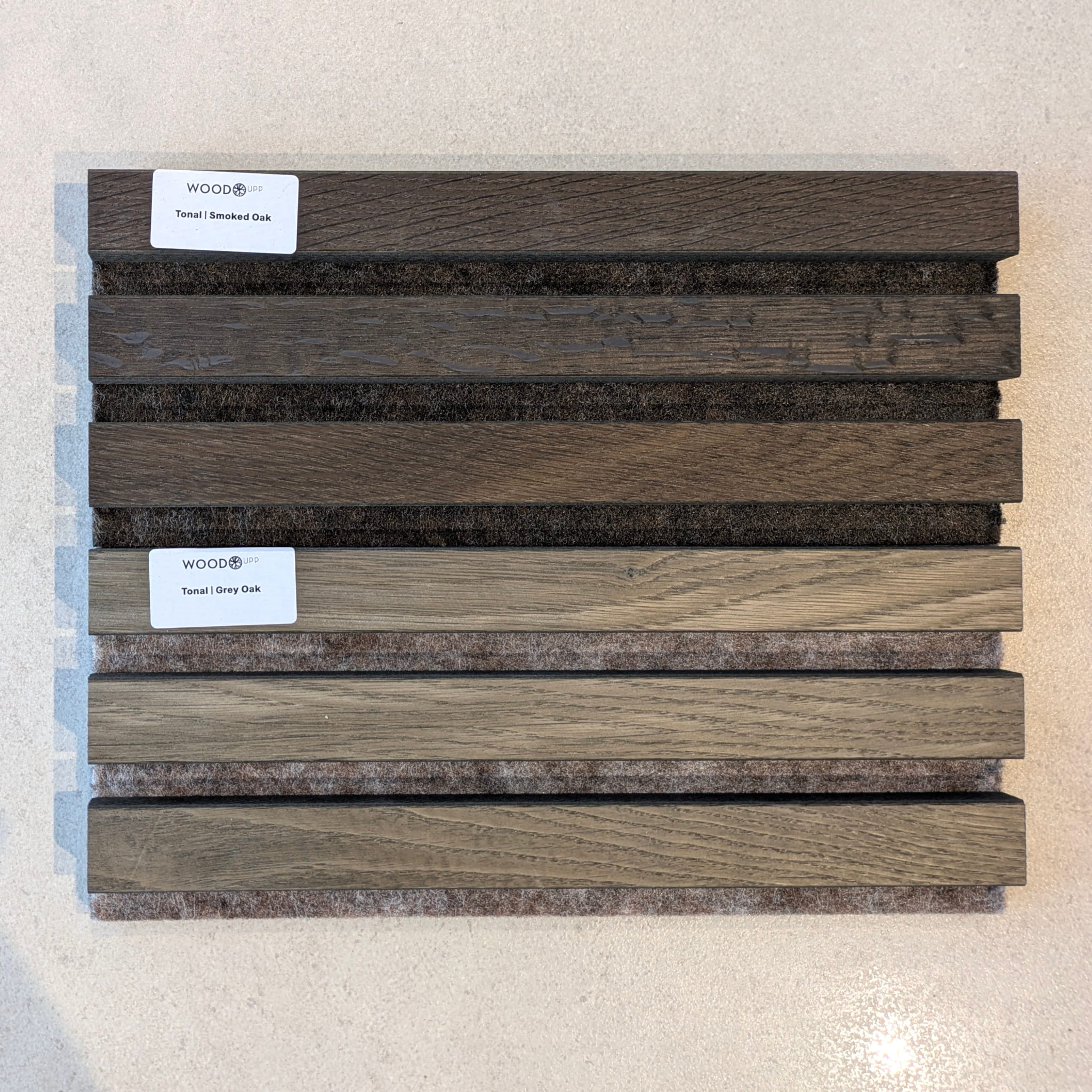 Akupanel Tonal Dąb Szary 240 x 60 x 2,2 cm – lamele na brązowym filcu Woodupp